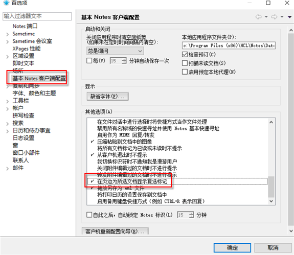 选择“基本Notes客户机配置”,在"其他选项"中,找到“在页边为所选文档显示复选标记”,勾上,然后确定,如下图: