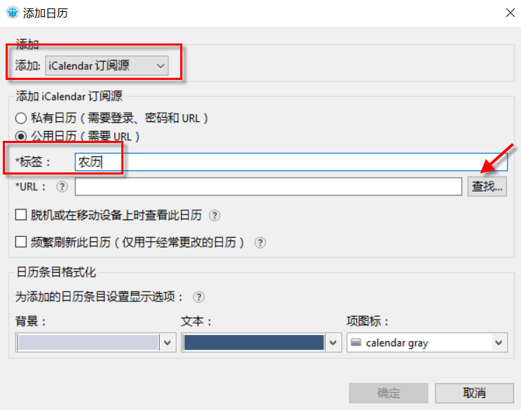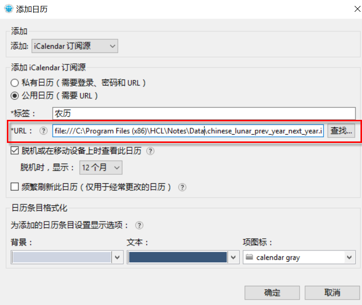 在出现的添加日历对话框中,设置如下图的选择,重要的是点击“查找”找到你的农历数据文件