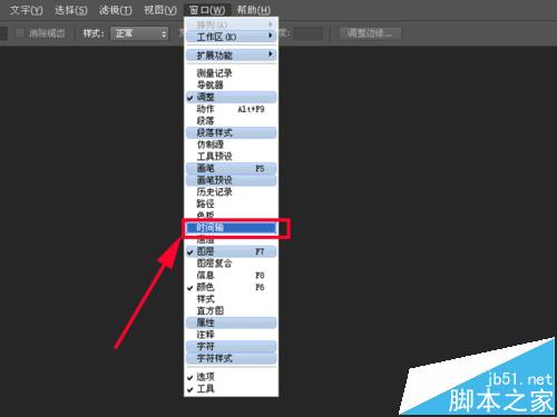 启动photoshop cs6,执行窗口-时间轴命令,在编辑区域下方调出时间轴,查看编辑窗口布局。