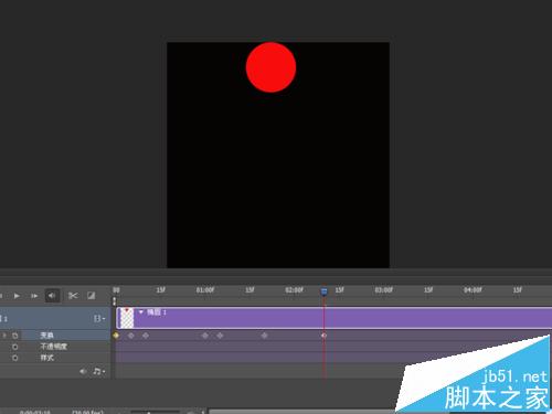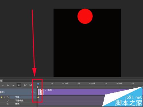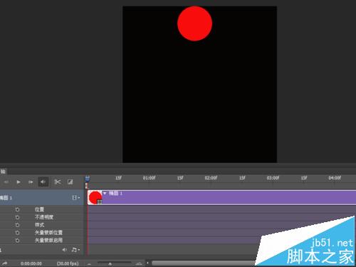 将指针移动到1s处,按住shift键将圆移动到低端。并且将圆的低端与画布的低端对齐。