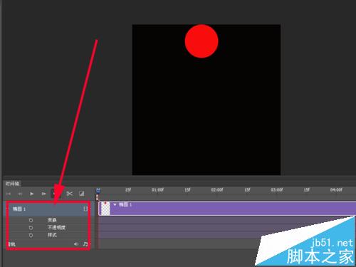 在时间轴面板中点击椭圆1右下角的三角形,展开该三角形下方里的所有选项,进行查看,有变换、不透明度和样式三项。