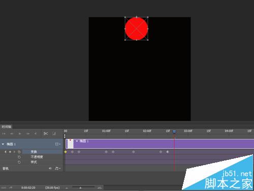 将指针移动到2-3s之间的15f处,执行编辑-自由变换命令,将圆的中心点移动到圆的顶端,垂直h设置为60%进而确定。
