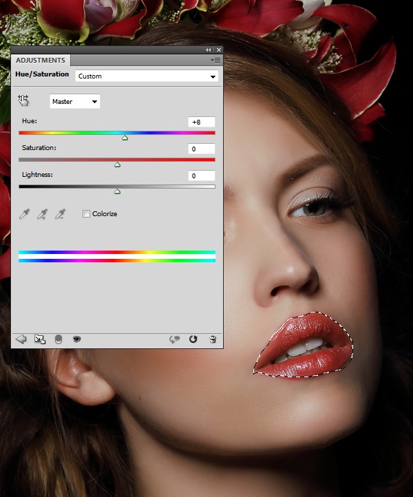 第二步 首先我们对嘴唇颜色进行修饰,使用多边形套索工具(快捷键l)选择出嘴唇,在图层面板》新建调整层》选择色相/饱和度,参数如图(色相+8)。