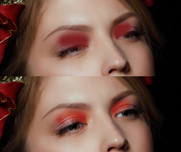 第三步 新建一个图层,使用柔角笔刷并将颜色值设为#7e2224对眼睛内边缘进行涂抹,范围如图。修改图层模式为叠加,透明度100%: