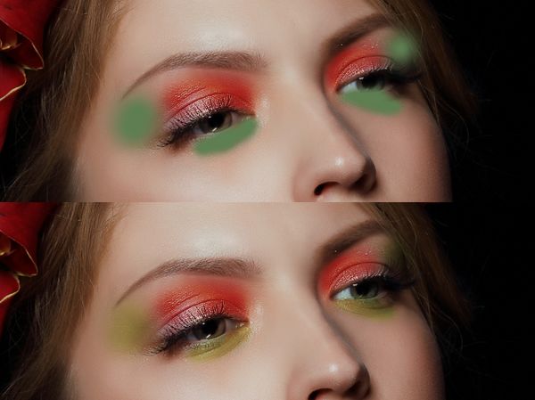 第4步 新建一个图层,使用柔角笔刷并将颜色值设为#5e8052对眼睛外边缘进行涂抹,范围如图。修改图层模式为叠加,透明度100%: