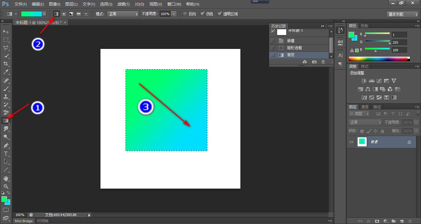 ? ? ? ? ? ? ? ? ? ? ? ?按住鼠标左键,按箭头方向拖动鼠标,即可填充渐变颜色。