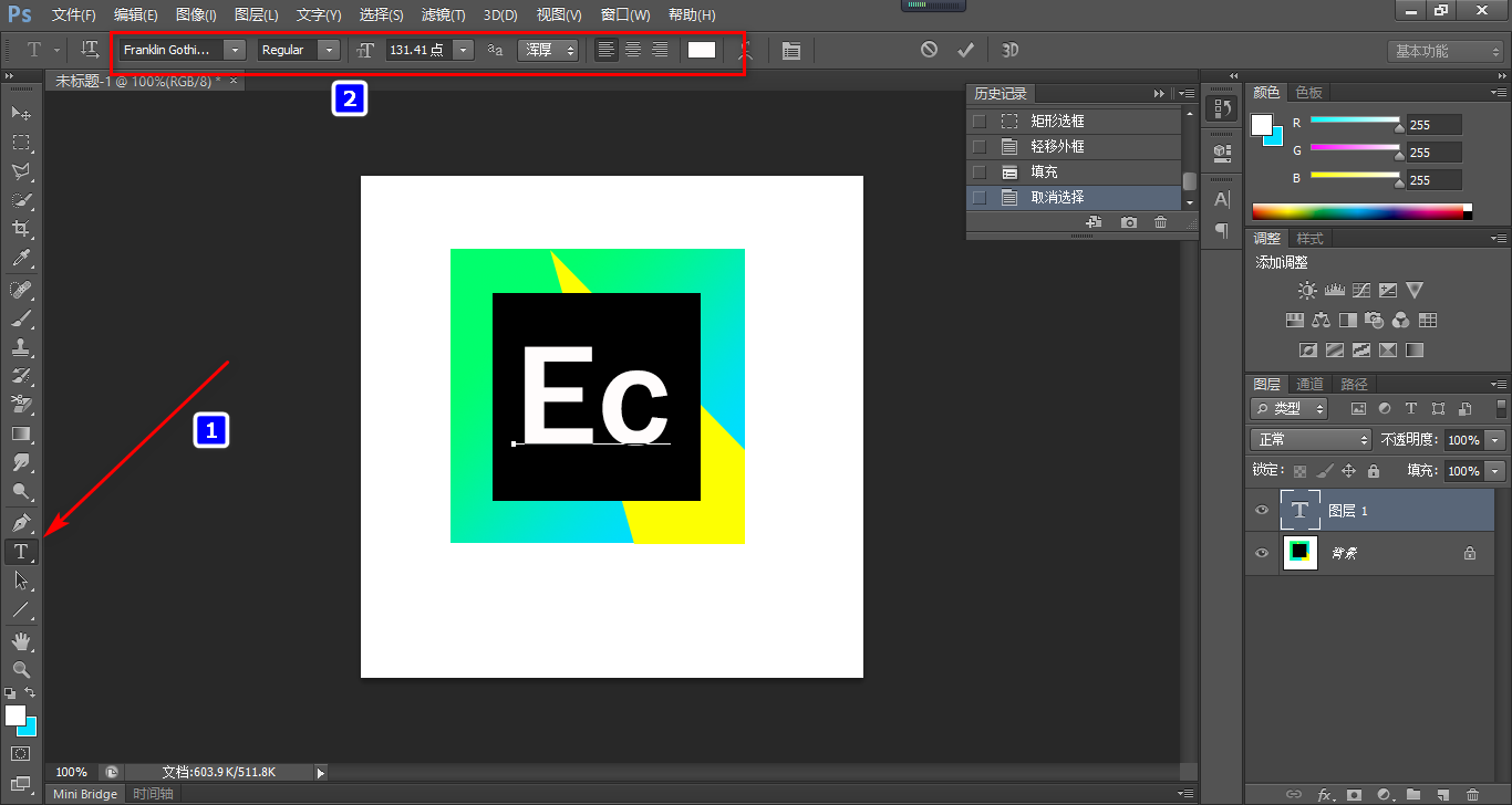 ? ? ? ?选择 横排文字工具(序号①),按序号②选框中的参数设置,在图中输入字母;