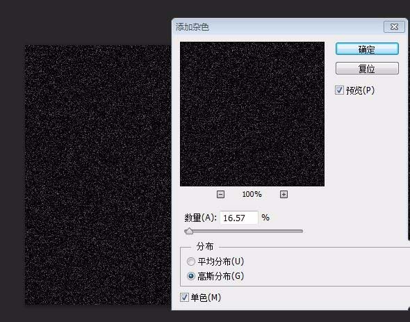 2、在打开的添加杂色对话框中,勾选高斯分布,单色,数量这个可以自己调,然后点击确定。