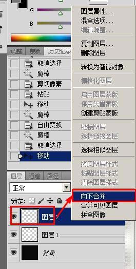 11、接着将主干和羽毛合并成一个图层,方法是在图层2(主干的图层)上右键单击,选择【向下合并图层】