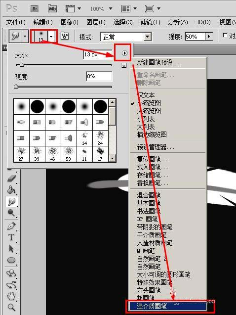 17、设置属性栏,点击画笔形状,在下面的菜单中,点击右面的这个小三角,在下拉菜单中选择【湿介质画笔】