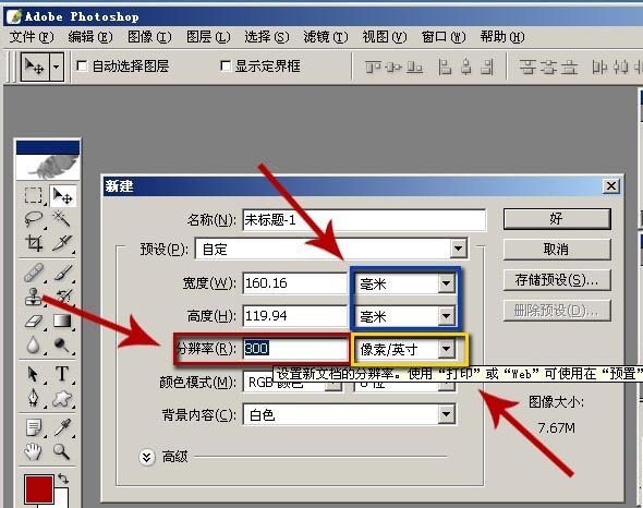 2、也许大家知道印刷品都是以毫米mm输入的,还要记住宽和高后面的单位,还有分辩率后面的像素单位。如图: