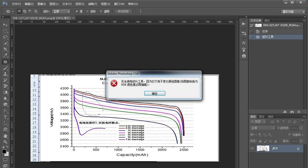 1、上传一张图片,我们发现,图层提示名称为“索引”,这个时候,我们是无法使用画笔修复工具的。