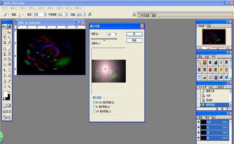 6、选择通道调板的rgb,使用滤镜的渲染的镜头光晕,参数如图。