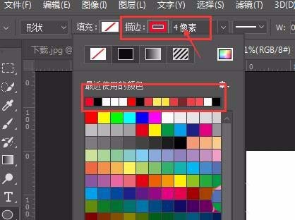 4、打开描边,将描边设置数值,数值大小根据自己建立的画布随时调整,颜色选择红色