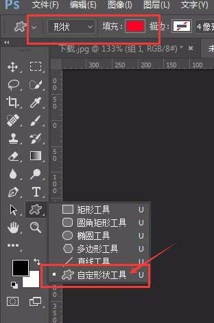 11、选择矩形工具中的“自定义工具”,将之前改动的“路径”改为“形状”,填充改为填充红色,描边关闭
