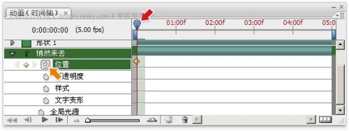 ,这表示启动了“位置”这一动画项目,并且将目前该文字层的位置(画面最右端)记录在起始时刻。时间轴区域中出现的黄色菱形就是该处包含记录的标志,这也称为关键帧,是时间轴的关键帧,与我们以前学习的过渡帧动画不同。