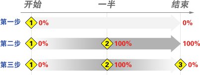 当我们在第一步中将关键帧1设为0%后,如果向后拉动时间标杆,会发现在所有时间内透明度都是0%。在第二步中设定关键帧2后,会发现12之间已有过渡效果,但关键帧2之后直到结束时,文字都始终显示。这就带出时间轴一个很重要的性质:某个时刻的关键帧设定会影响该时刻之后的所有时间。因此关键帧1的设定导致了之后所有时间内(12之间、23之间)文字图层全程都是0%。而当关键帧2设定后,既在12之间形成了过渡,也导致了23之间变为了全程100%。直到关键帧3设定完成,23之间形成过渡。