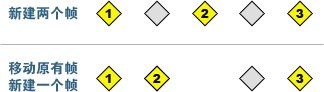 大家可能会想在原有的帧2前后再新增两个帧,如下图上方所示。其实只需按照下方所示移动原帧2,然后新增一个帧即可。其设定可由原帧2拷贝而来。这样我们就完成了淡入淡出的修改。