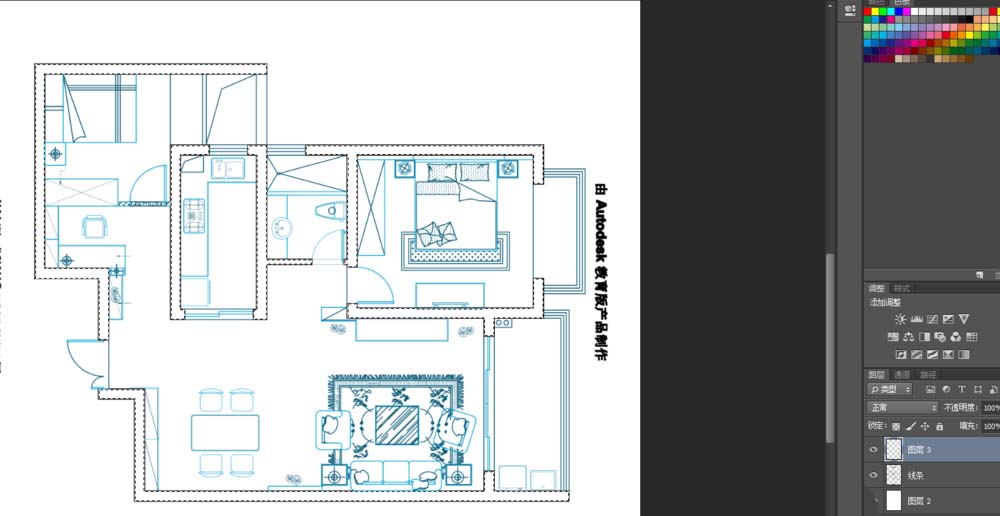 4、将图层3命名“墙体填充”,用ps打开地毯贴图,将贴图拖到文件中,产生新的图层3,将其命名“地毯”。调整地毯的大小并拖到相应区域,关闭“地毯”,选择“线条”,w,选中地毯覆盖区域,显示并选择“地毯”,ctrl+shift+i反选,delete,删掉了不需要填充的地方。