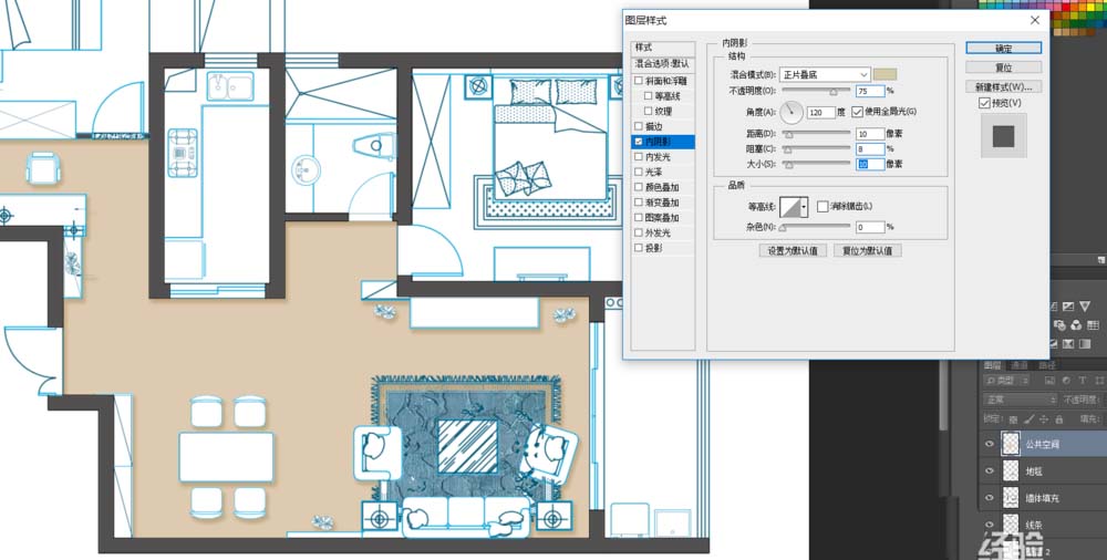 5、填充地面:新建图层“公共空间”,设置前景色,选择“线条”,w,选择公共区域,选择“公共空间”,alt+delete填充前景色,ctrl+d取消选择。设置图层样式:勾选“内阴影”并设置角度、距离、大小等,“确定”。单击减淡工具,选择画笔,涂抹窗户、门等地产生层次感。也可以同时搭配加深工具,对墙边、角落等地进行涂抹,形成阴影效果。