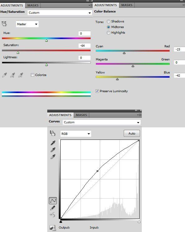 5、在这一步中,我们将会用到很多调整图层,例如色相/饱和度调整图层、色彩平衡调整图层、曲线调整图层及其剪贴蒙版,以减少主体的饱和度,使之更亮。