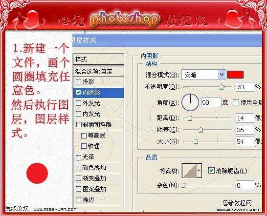 1、新建一个文件,新建一个图层用椭圆选框工具画个小正圆,填充任意颜色,然后双击图层调出图层样式,参数设置如下图。