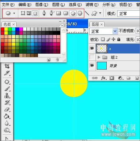 打开视图,标尺,拉出两条参考线。选择你喜欢的颜色做前景色,(我用的明黄)选择椭圆工具,把光标对准参考线的交织处,按住shift alt画一个正圆。