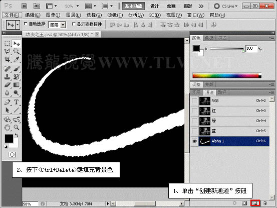 3、隐藏路径,打开“通道”调板,新建“alpha 1”通道,为选区填充白色。