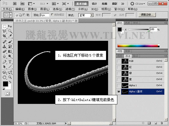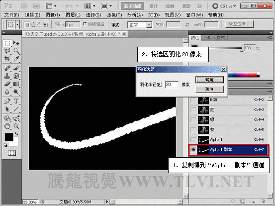 4、复制“alpha 1”通道,将选区羽化并调整选区位置填充黑色。