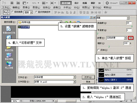 8、切换至“功夫之王”文档中,复制“alpha 1 副本”通道,载入“alpha 1”通道选区,执行“滤镜”→“扭曲”→“玻璃”命令。