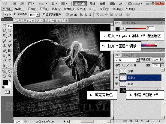 5、载入“alpha 1 副本”通道选区,切换至“图层”调板新建图层并填充白色。