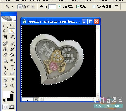 2、现在要把中间的宝石盒单独抠出来,这是一张全黑背景的,所以非常好抠,直接用魔术棒就可以了。选择魔术棒工具,在黑色背景上点一下,就把黑色背景全选起来了~