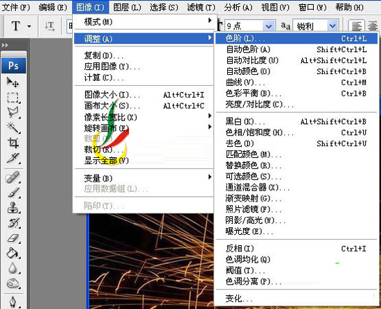 步骤七、接着在图层面板中,我们选择图层1,然后点击菜单栏中的图像>>调整>>色阶,如图所示: