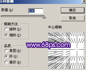 7、执行:滤镜 > 模糊 > 径向模糊,参数设置如图9,确定后按ctrl + f 3次加强光束,效果如图10。