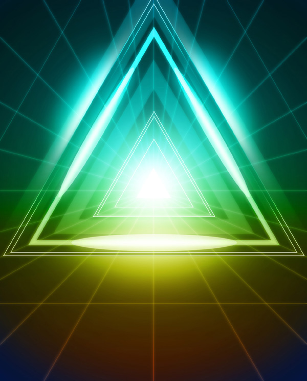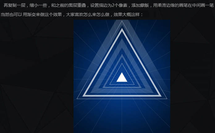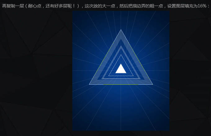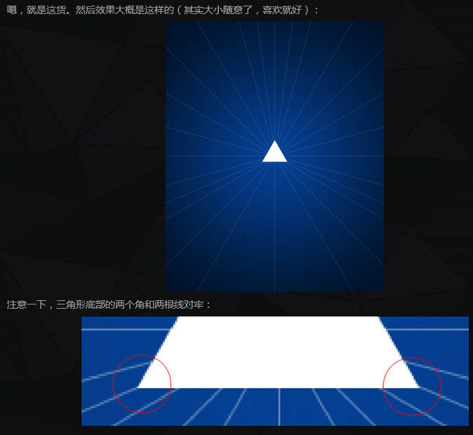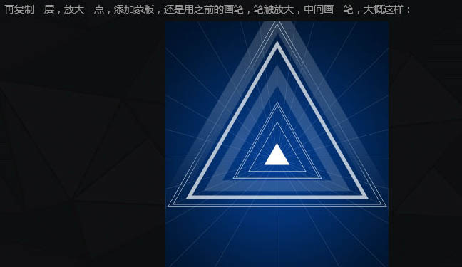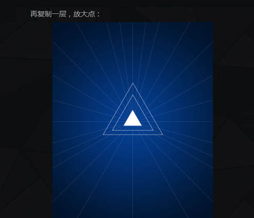 效果图主要由放射光束及三角形框构成。每一部分虽然简单,都是由相似的图形构成,不过复制的时候还需要经过模糊及增加高光等操作,这样效果才更有层次感。