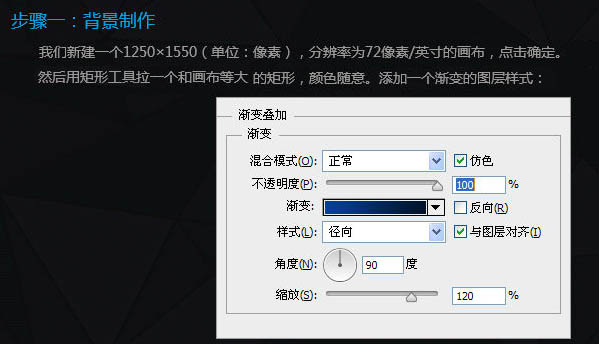 我们新疆一个1250 * 1550,分辨率为72像素/英寸的画布,点击确定后。然后用矩形工具拉一个和画布等大的矩形,颜色随意,添加一个渐变的图层样式。