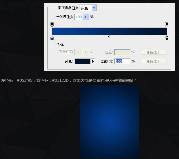 颜色设置左侧为:#053f95,右侧为:#01122b,效果如下图。