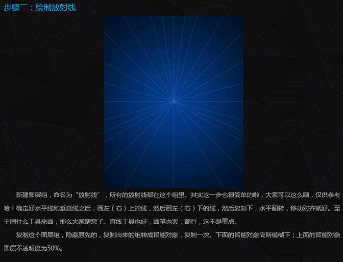 新建图层组,命名为“放射线”,所有的放射线都在这个组里。其实这一步也很简单。大家可以这么画:确定好水平线和垂直线之后,画左上的线,然后画左下的线。然后复制下,水平翻转,移动对齐就好。至于用什么工具来画,那么大家随意了,直线工具也好,画笔也罢。