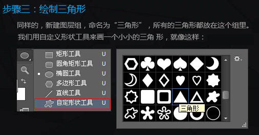 同样的,新建图层组,命名为“三角形”,所有的三角形都放在这个组里。我们用自定义形状工具来画一个小小的三角形。