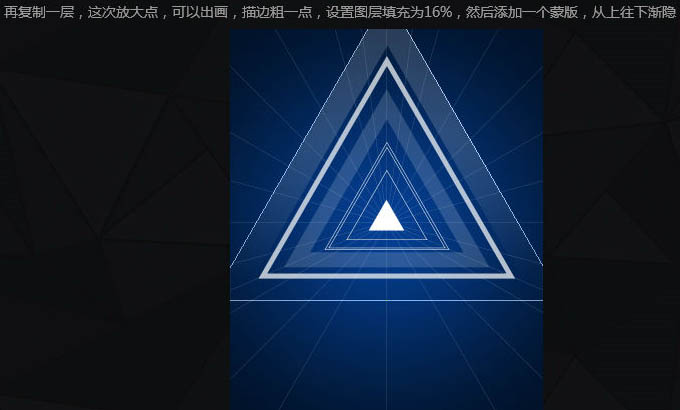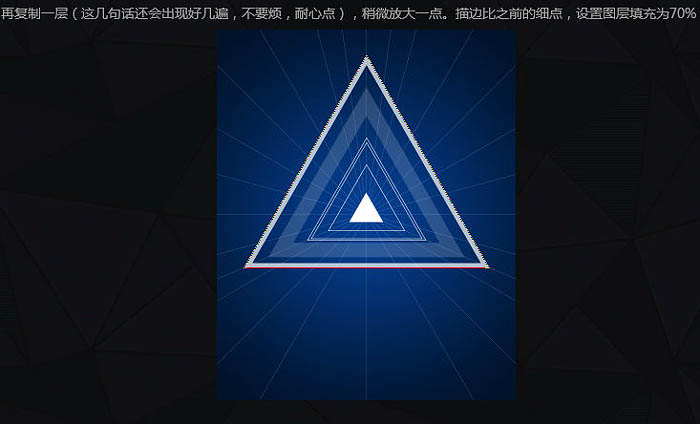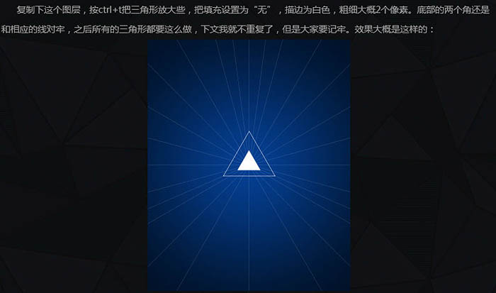 复制下这个图层,按ctrl + t 把三角形放大些,把填充设置为“无”,描边为白色,粗细大概2个像素,底部的两个角还是和相应的线对齐,之后所有的三角形都要这么做。