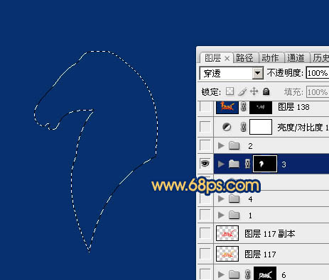 2、新建一个1000 * 700像素,分辨率为72像素的文件,背景填充暗蓝色。新建一个组,用钢笔勾出马头主体轮廓,转为选区后给组添加图层蒙版,如下图。