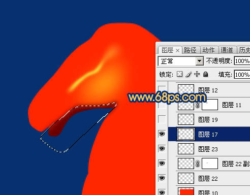 5、新建一个图层,用钢笔勾出马嘴底部的暗部选区,羽化3个像素后填充暗红色。