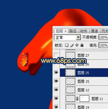 4、新建图层,先给中间位置渲染一点橙黄色高光,图4位置用画笔涂抹,图5需要用钢笔勾出路径转为选区后羽化1个像素填成橙黄色,局部可以用涂抹工具涂抹处理。