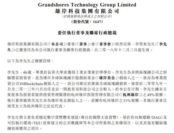 2018年9月30日,李笑来发微博称要退出币圈,但表示依然长期看好区块链。”不过,才短短两个月的时间,他就“变卦”了。12月3日,香港主板上市公司雄岸科技(HK1647)公告,李笑来出任雄岸科技执行董事与联席CEO。