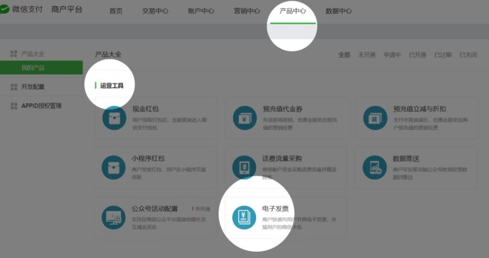 - 第二步,商户在微信商户平台—产品中心,开通“电子发票”服务(https://pay.weixin.qq.com),并选择区块链电子发票开票模式。