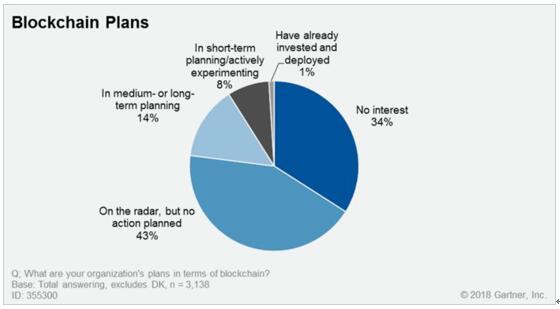 Gartner公司最近对CIO进行的一项调查也体现出这一趋势。Gartner公司发布的2018年首席信息官调查显示,只有1%的CIO在其所在组织中采用某种形式的区块链解决方案,而只有8%表示他们正在对区块链技术进行短期规划或积极尝试。