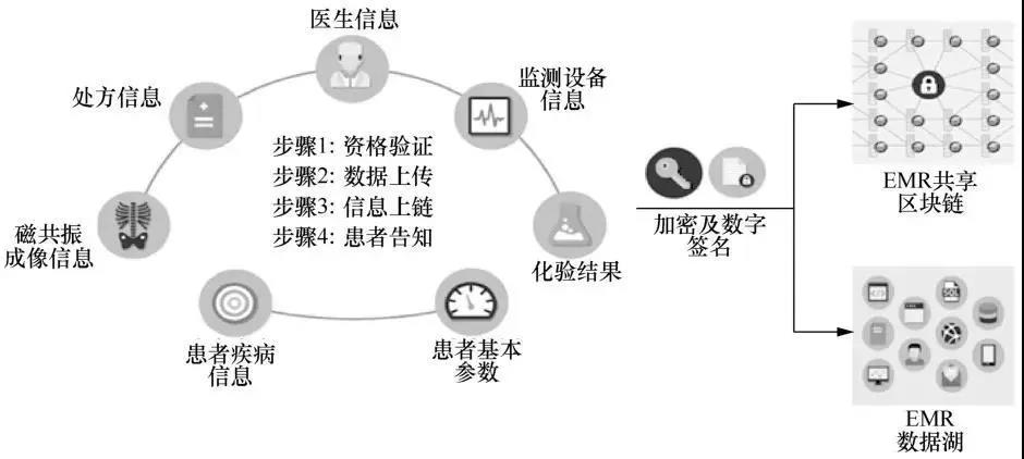 EMR共享区块链模型具有较强的可扩展性。每个区块记录患者的唯一身份识别信息、经过加密的病历以及病历的时间戳。为改善数据通达效率,区块中还以标签形式记录了数据格式等元数据内容。所有医疗数据都存储于被称作数据湖(data lake)的数据库中,其可存储各种不同类型的数据(包括图像、文档等),这种存储是加密并结合数字签名技术的。数据湖中的数据在进行数据分析时具有极高的价值。