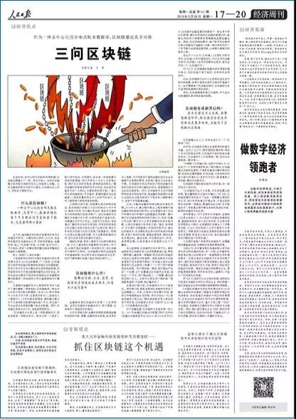 在吵吵嚷嚷了几年之后。2018年2月26日,中国官方最高媒体《人民日报》经济版整版刊发了区块链署名评论文章《三问区块链》《抓住区块链这个机遇》及《做数字经济领跑者》,肯定了区块链技术未来广阔的发展前景,有望重塑一个值得信任的社会关系。
