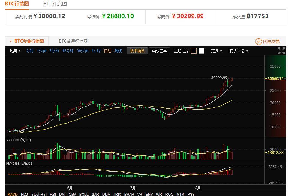 数据显示,今天(8月17日)下午,比特币价格盘中突破了30000元大关,最高摸高到30299元。一个月前的7月17日,比特币价格为14300元左右。一个月内,价格实现了翻倍。这样,在今年,比特币接连突破了1万元、2万元、3万元三个整数关口,对应的时间点分别是5月10日、6月6日、8月17日。这样的涨势可以说是突破了人们对于投资品的想象。