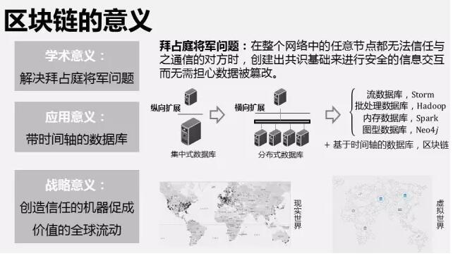 二是应用意义,随着数据库从集中式纵向扩展,向分布式横向扩展发展,纵向扩展就是通过添加内存、存储和CPU,增强单台机器的性能。这种纵向扩展会遇到吞吐量瓶颈等问题。分布式数据库通过横向扩展,提升了吞吐量和计算效率,也开启了大数据时代。分布式数据库主要分为以Storm为代表的流数据库,Hadoop为代表的批处理数据库,以Spark为代表的内存数据库和以Neo4j为代表的图形数据库。区块链的意义在于,增加了一个分支,基于时间轴的分布式数据库。